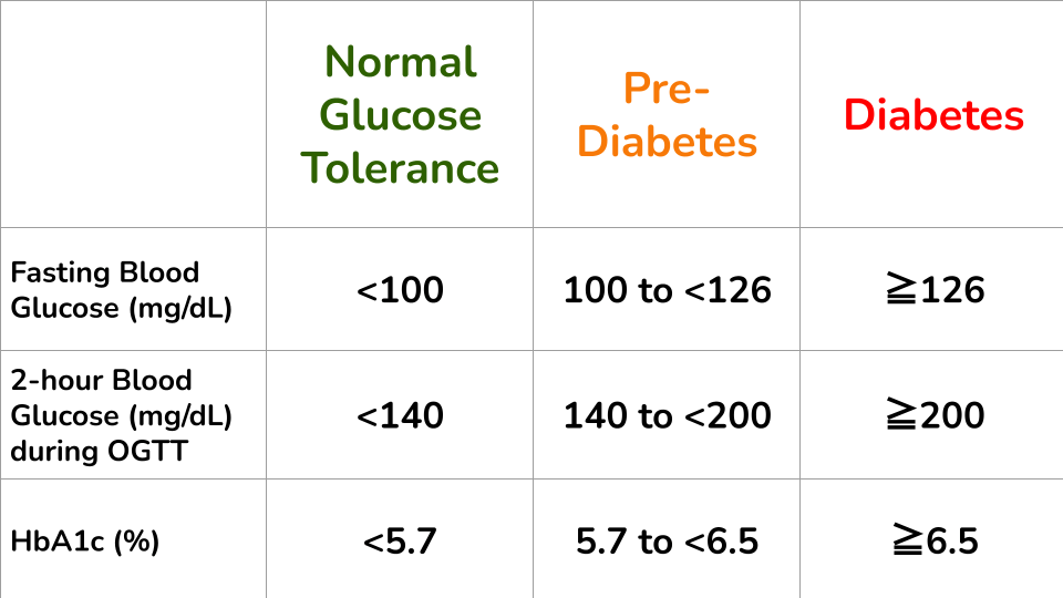 在大多数国家,如果空腹血糖为 126 mg/dL 以上、糖化血红蛋白为 6.5% 以上,或者在口服葡萄糖耐量测试 (OGTT) 中饮用含有 75 克纯葡萄糖的饮料后两小时血糖浓度超过 200 mg/dL,则可诊断为糖尿病。请参阅下表,其中总结了美国糖尿病协会的诊断标准