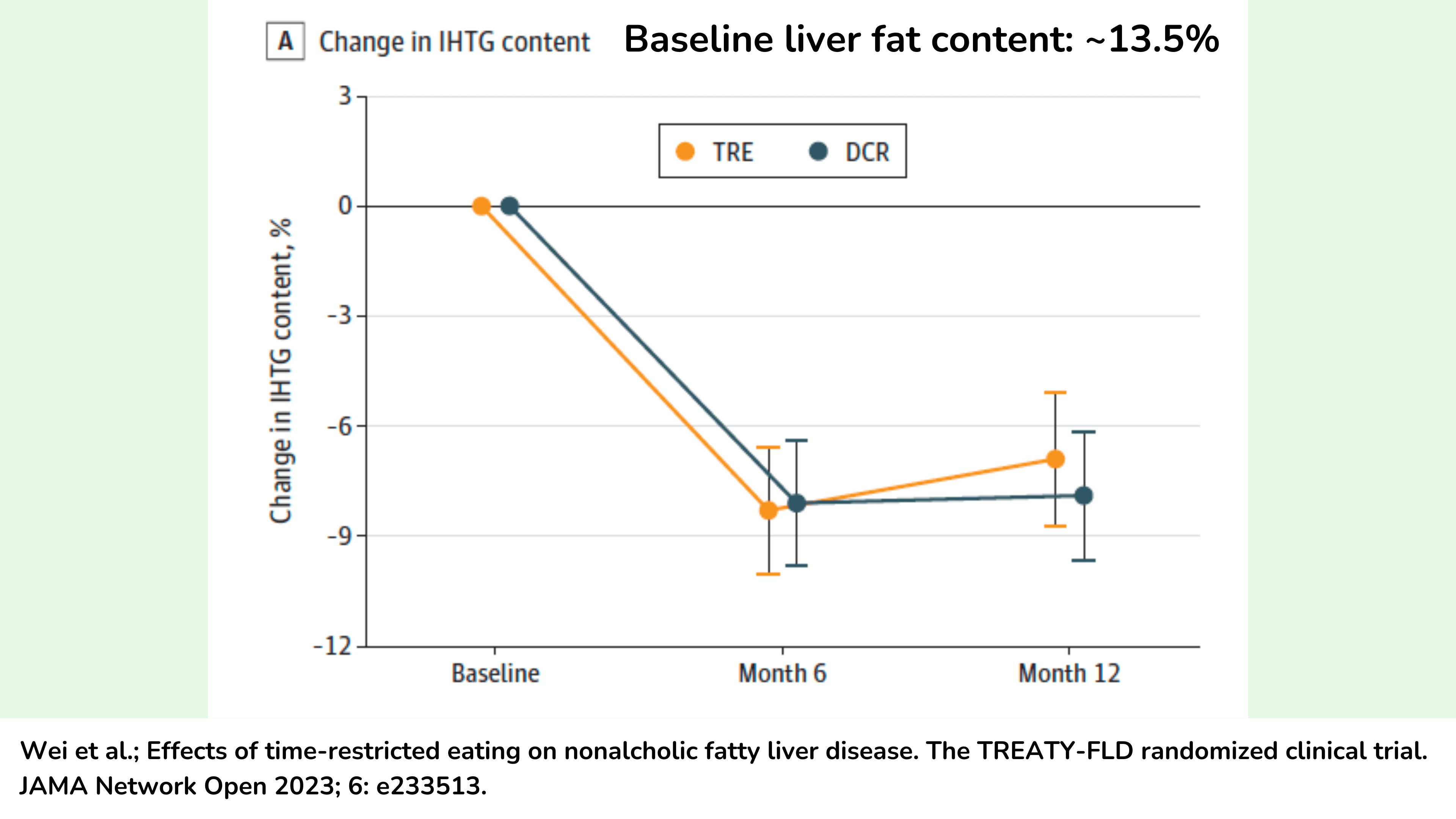 首先,我想分享一项高质量试验的数据,该试验研究了限时进食对内脏和肝脏脂肪的影响。Wei团队的这项试验于去年发表。他们招募了 88 名患有肥胖症和非酒精性脂肪肝病 (NAFLD) 的参与者,随机分为两组:一组限制每天的热量摄入量,持续一整年(对照组);一组限制热量摄入量,同时遵循 8 小时早TRE限时进食,仅在上午 8 点至下午 4 点之间进食。