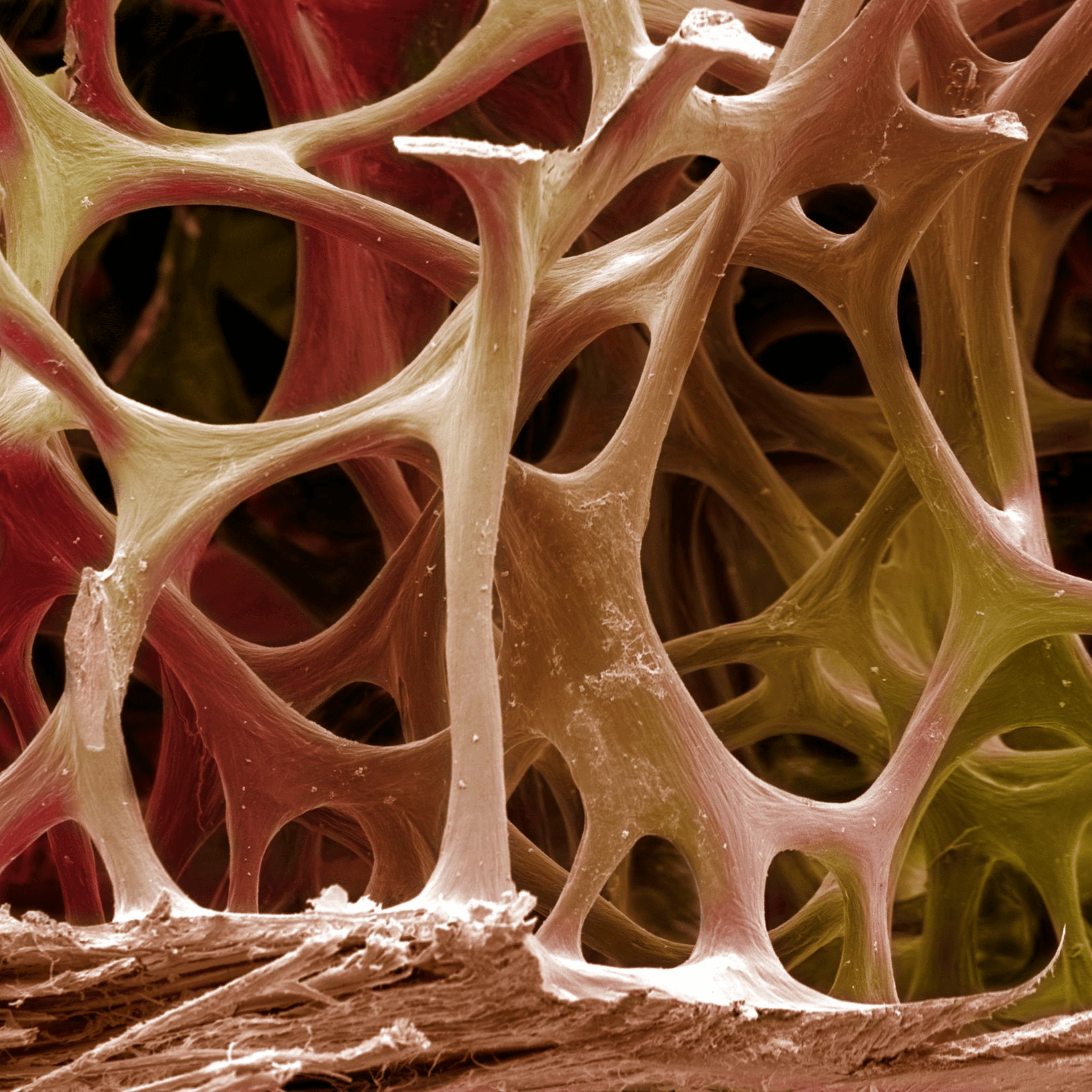 现在,这是一种特殊的海绵状骨骼,但即使从总体上讲,骨骼也具有某种开放的蜂窝状结构。人体构建骨骼的方式是铺设一种胶原蛋白纤维。您可以在上图底部清楚地看到这些胶原蛋白纤维。这些纤维形成束,但它们本身相当柔软。只有当钙和磷等矿物质附着在它们身上时,它们才会变硬。