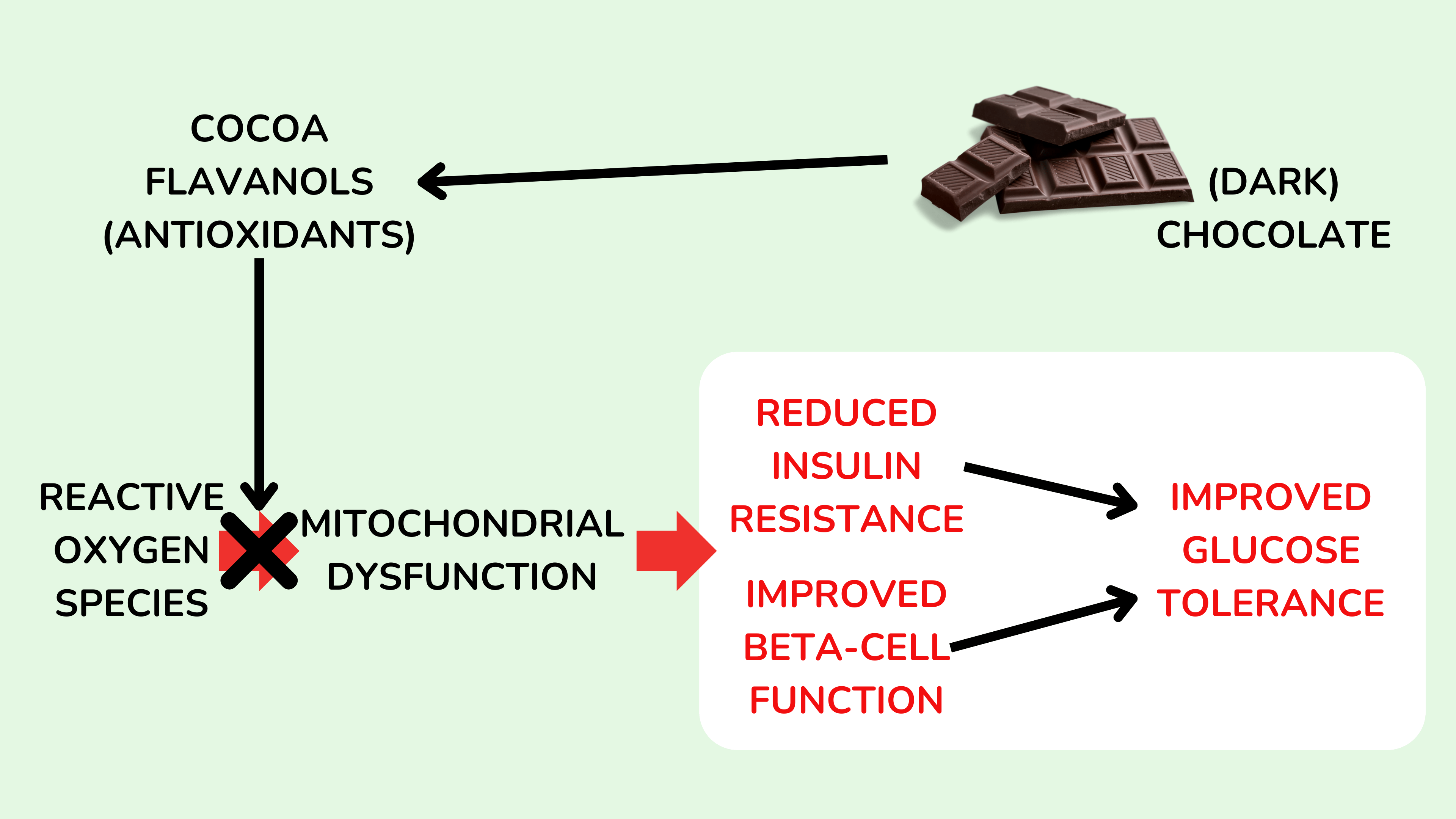 • 黄烷醇的抗氧化与抗炎作用:黑巧克力中的可可黄烷醇可能通过减少氧化应激和炎症,改善线粒体功能,从而增强胰岛素敏感性。